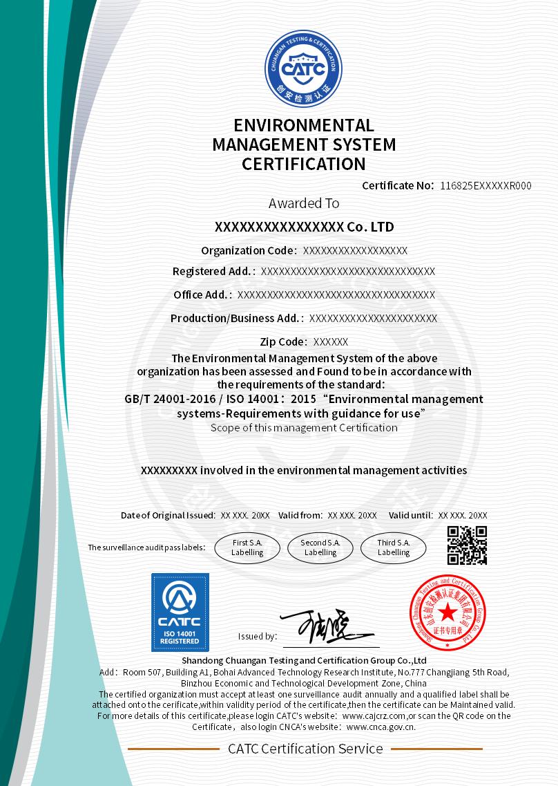 5、申请组织已经按照ISO 14001标准建立文件化的管理体系(包括管理手册、程序文件、最近12个月内外部环境事件清单、完整的内审资料、管理评审资料等);